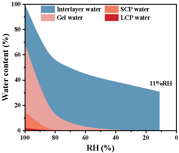随着RH降低,凝胶水含量显著减少,层间水含量先增加后降低,这主要是由于凝胶水的失去导致C-S-H层间距的减小,凝胶孔向层间孔转变。85% RH平衡后HCP内仍有16.45%的凝胶水和42.04%的层间水。59%RH平衡后HCP内凝胶水含量仅为1.99%,层间水含量达到41.61%。随着RH的降低,层间水含量开始下降,11%RH平衡后HCP内部层间水含量仅为30.73%。