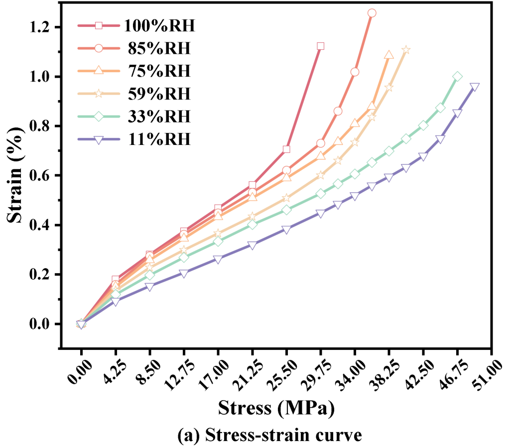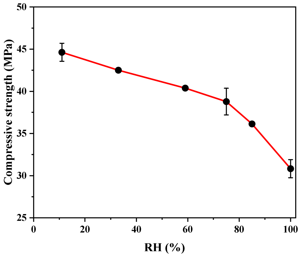 图4为不同环境湿度平衡情况下HCP的抗压强度。抗压强度随着RH增加而降低。