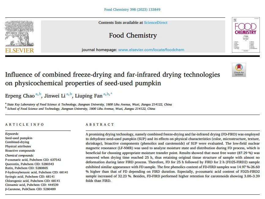 研究人员采用了一种很有前景的干燥技术,即冷冻干燥和远红外干燥(FD-FIRD)联合技术,对种子用南瓜(SUP)进行脱水,并评估了其对南瓜的物理特性(颜色、微观结构、质地、收缩率)、生物活性成分(酚类和类胡萝卜素)的影响。低场核磁共振(LF-NMR)用于分析脱模过程中的水分状态和分布,这有利于选择合适的水分转移点。结果表明,当干燥时间达到 25 小时时,大部分游离水(87.29%)被去除,从而保留了样品的原始组织结构,在后期的热固性脱脂过程中几乎没有变形。因此,干燥 25 小时后再进行 2 小时热固性脱脂(FD25-FIRD2)的样品与干燥脱脂样品的外观相似。FD-FIRD 样品的游离酚含量比 FD 样品高 14.97 %-26.60 %,这取决于 FIRD 的持续时间。特别是 FD25-FIRD2 样品的对香豆酸含量增加了 32.23%。此外,FD-FIRD 的类胡萝卜素保留率比 FIRD 高 3.00-3.39 倍。
