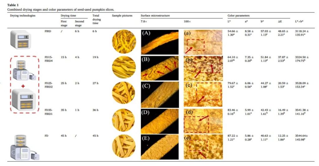 籽用南瓜(Cucurbita maxima Duch.)由于其种子丰富的营养价值而受到越来越多的关注。然而,籽用南瓜果肉的工业化利用仍然受到限制。此外,新鲜籽用南瓜含水量高,易腐烂变质,不利于贮运。以往的研究表明,不同的干燥方法会显著影响新鲜原料的质量。冷冻干燥(FD)又称升华干燥,通过固态冰的升华去除产品中的水分。由于低温和低压环境,与其他干燥方法相比,冷冻干燥能生产出外观更好、营养保留率更高的优质干燥产品。然而,FD 是一种耗时耗力的工艺,限制了它在食品工业中的应用。因此,有必要在保持干燥产品品质的同时,减少干燥过程中的长时间和高能耗。近年来,研究人员通常将 FD 与热风干燥、远红外辐射干燥(FIRD)和微波干燥等其他各种干燥方法结合使用,以达到上述目的。与各种组合干燥方法相比,FD 与 FIRD 的组合(FD-FIRD)因 FIRD 的干燥特性而受到越来越多的关注。因此,本研究的目的是:(i) 根据 SUP 切片的水分状况和分布,选择适当的水分转移点;(ii) 研究 FD-FIRD 对 SUP 切片的外观(颜色、微观结构)、物理属性(硬度、收缩率)和生物活性化合物(游离酚、酚酸、类胡萝卜素总量和 β-胡萝卜素)的影响。