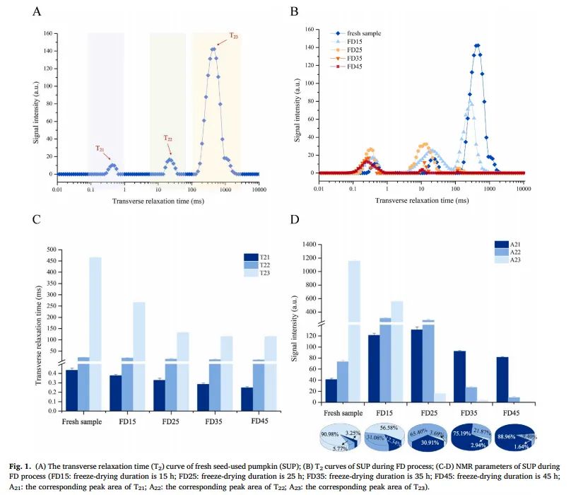 图1. (A) 鲜种用南瓜(SUP)的横向弛豫时间(T2)曲线;(B) 南瓜在冻干过程中的 T2 曲线;(C-D) 南瓜在冻干过程中的 NMR 参数(FD15:冻干时间为 15 小时;FD25:FD35:冷冻干燥持续时间为 35 小时;FD45:冷冻干燥持续时间为 45 小时;A21:T21 对应的峰面积;A22:T22 对应的峰面积;A23:T23 对应的峰面积)