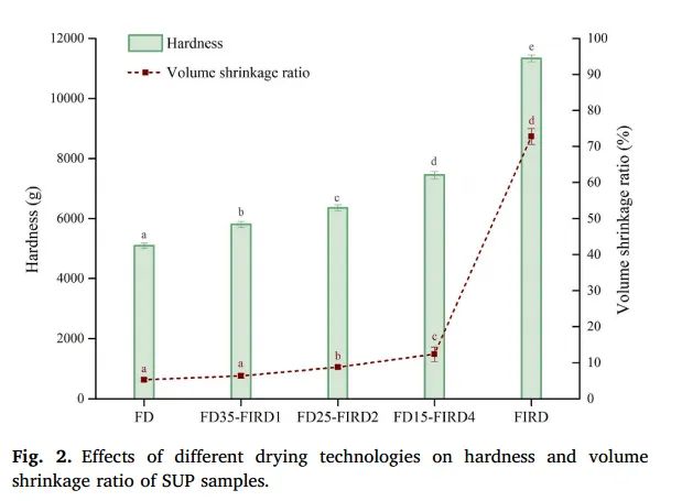 图2. 不同干燥技术对 SUP 样品硬度和体积收缩率的影响