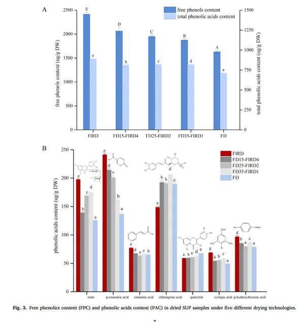图3. 五种不同干燥技术下干燥 SUP 样品中的游离酚含量(FPC)和酚酸含量(PAC)