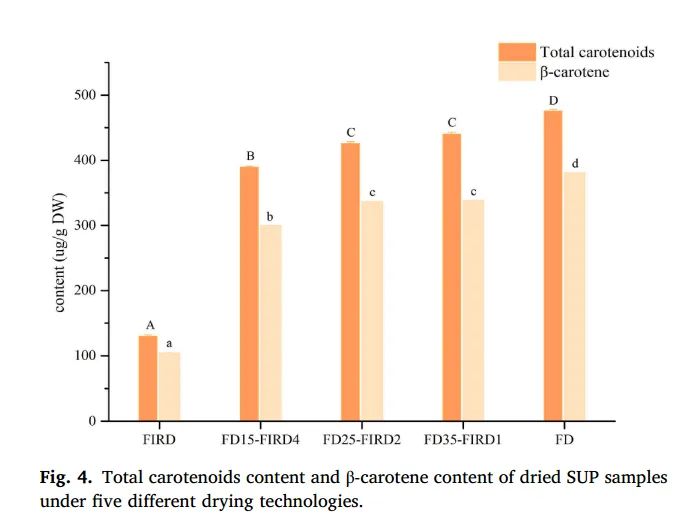 图4. 五种不同干燥技术下干燥的 SUP 样品的类胡萝卜素总含量和 β-胡萝卜素含量