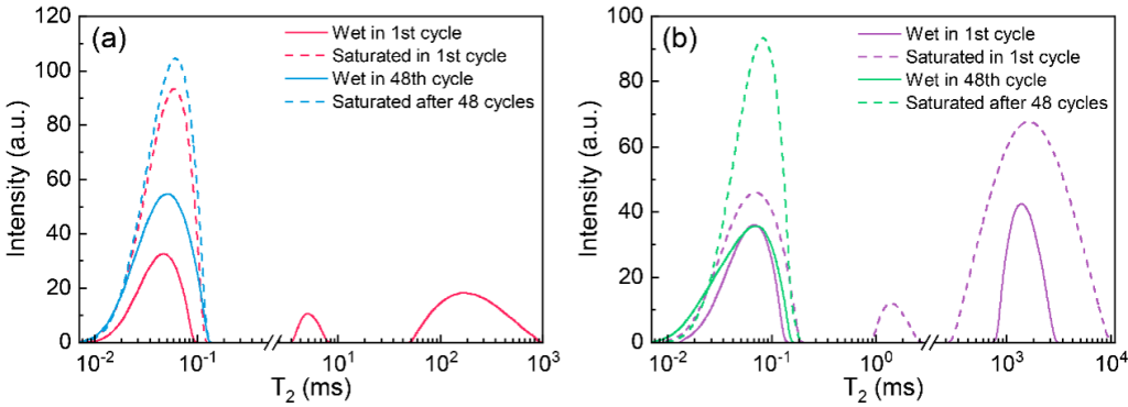 图10 (a)未损坏试样和(b)应变为5.70%的试样在四种情况下的核磁共振结果,包括第1个循环和第48个循环的湿润阶段之后、第1个循环的饱和结果(由试样C-1和C-2测试)和第48个循环之后的饱和结果(由试样S-1和S-3测试)。