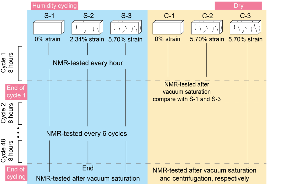 各试样的具体测试方案见图5。在第一个周期中,三个实验试样每小时进行一次测试,以监测水分在不同裂纹水平下的迁移动态。第一个周期结束后,对试样C-1和C-2分别进行干燥和饱和处理,以进行核磁共振测试。
