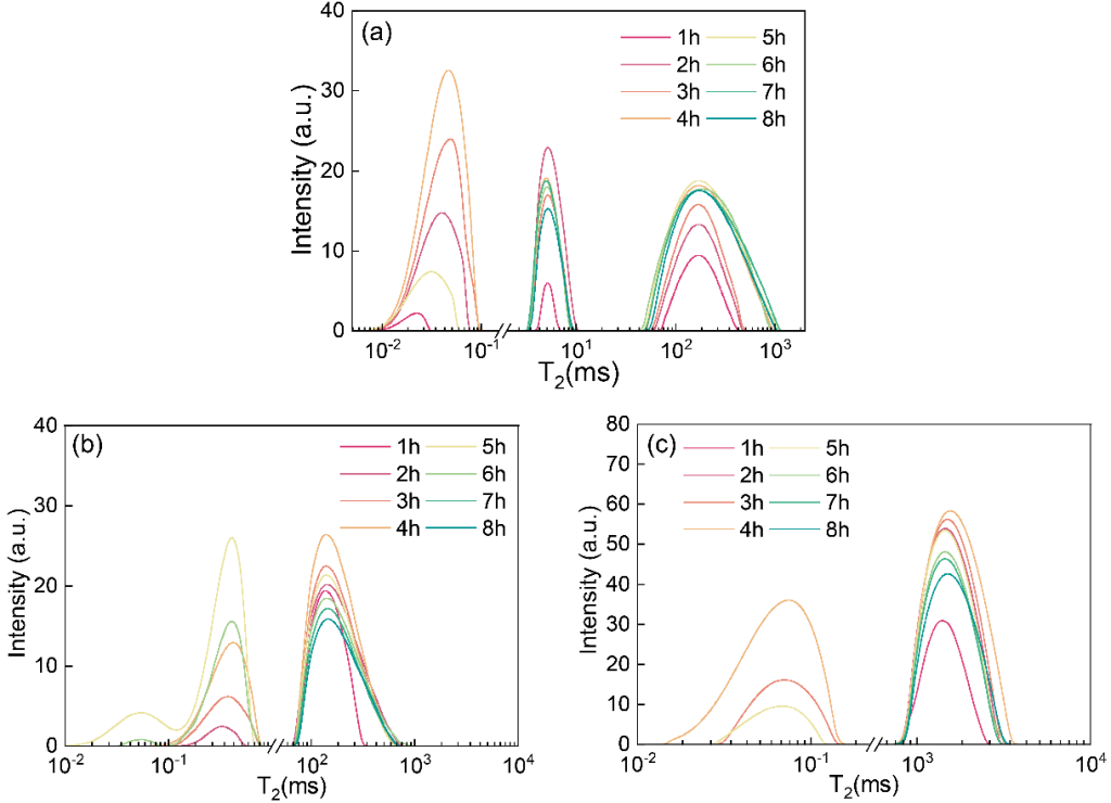 图7 样本S-1(a)、S-2(b)和S-3(c)在第一个湿度循环期间的T2谱图