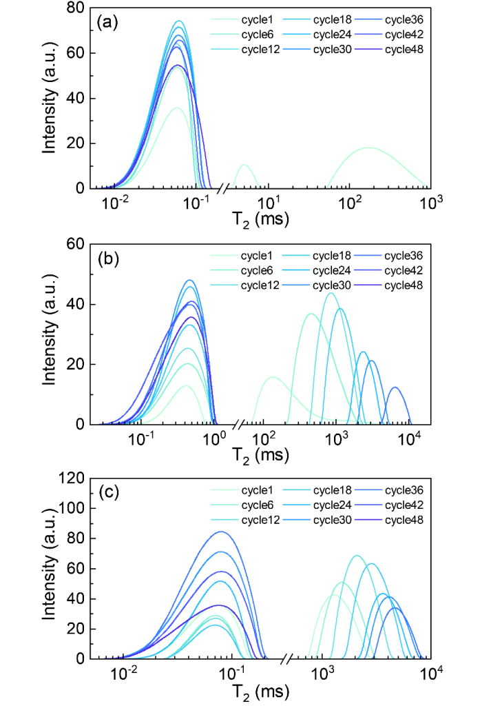 1.虽然三个试样的左峰所对应的T2值保持一致,但其形状存在细微差别。相反,未损坏试样的右峰在六个周期后不再出现。受损的试样的右峰则表现出相似的形状和明显的继续右移趋势,最终在实验结束前消失。