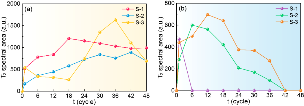 实验试样随后每隔六个周期(48小时)进行一次测试。试样S-1和S-3再次进行真空饱和与核磁共振测试。