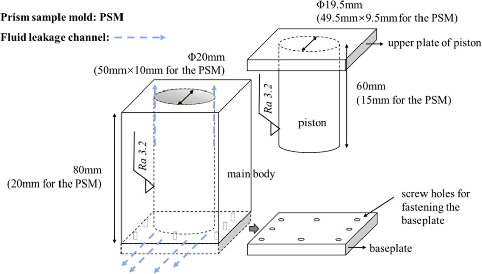 在这项工作中使用两种钢模具,一种是圆腔部分(ф20毫米),另一种是矩形腔部分(50毫米×10毫米),用于制备C-S-H块样品。模具的结构如下图所示。样品完成挤压后,导出模具,并放置在密封室架子上,架子下有足够的去离子水,使其完全湿润。制备了三组C-S-H样品,标记为C09H、C12H和C15H,原材料配方中的Ca/Si比率为0.9、1.2和1.5,样品的测量体积密度为1.69g/cm3。对于Ca/Si比为0.9的配方,再制备一个C-S-H样品,表示为C09L,测量的体积密度为1.50g/cm3。