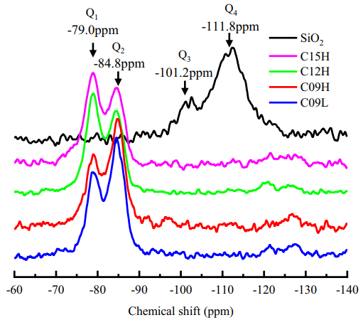如图3所示,硅核磁共振被用来接收更多关于所获得的C-S-H样品结构的信息。对于SiO2,观察到两个峰值,分别为-101.2ppm的Q3和-111.8ppm的Q4。对于C-S-H样品,检测到另外的两个峰值,分别为-79.0ppm的Q1和-84.8ppm的Q2,而Q3和Q4信号发生消失,表明完全消耗掉了SiO2。