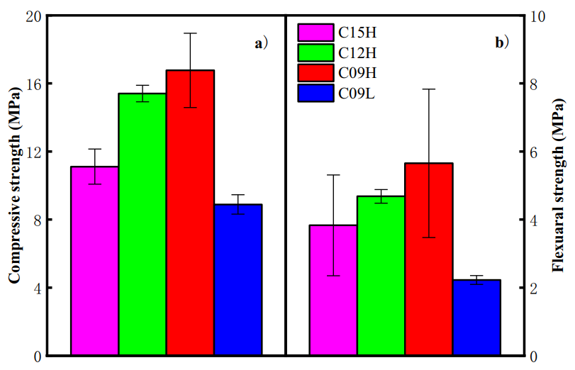 在标准固化条件下进行6个月的固化后,块状样品直接用于机械测试,无需进一步处理。圆柱体样品的压缩强度由电子万能试验机进行测试。加载率被设定为0.3毫米/分钟。用三点弯曲法测试了圆柱体样品的柔性强度。
