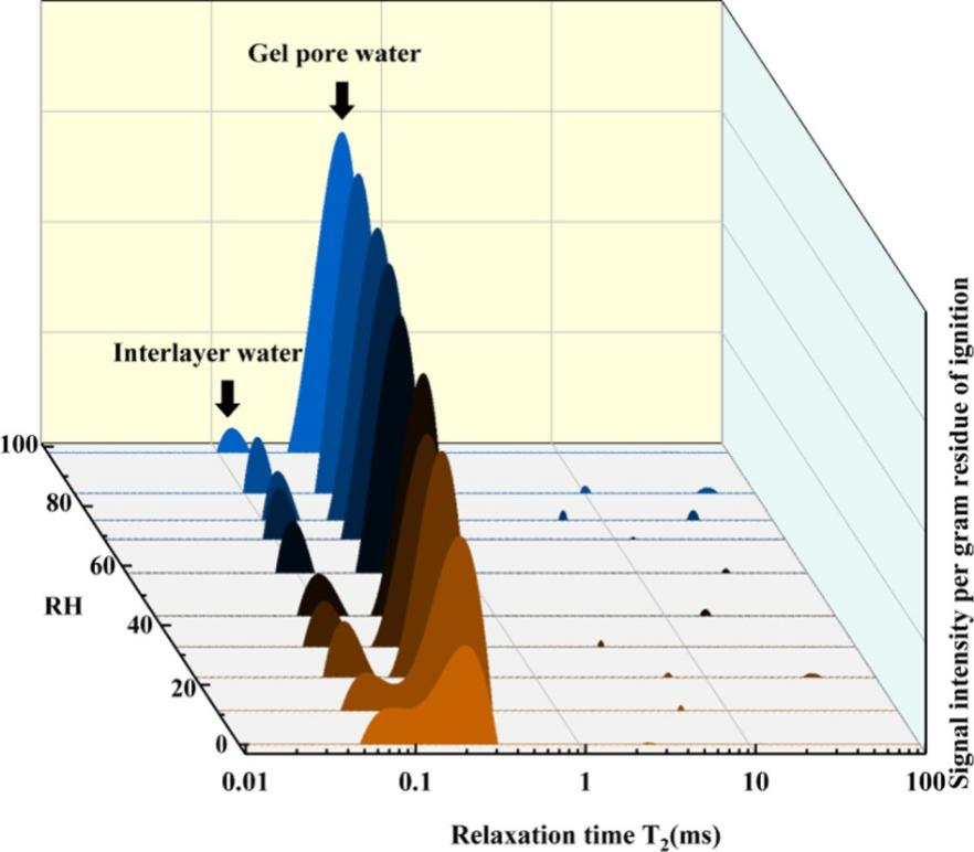 基本上,从图6中可以看出。层间水的T2值在D-R循环期间没有表现出明显的变化,而凝胶孔隙水的T2值在干燥期间逐渐减少,在随后的再饱和过程中增加,这可以用一个简单的水去除-补充过程来解释。有趣的是,在给定的RH(RH>11%)下,重饱和度曲线中的凝胶孔隙水的T2值低于干燥曲线中的T2值,这表明当C-S-H经历了严重的干燥处理(RH为0%)时,与初始饱和C-S-H中的凝胶孔隙水相比,水分子在C-S-H凝胶孔隙中的约束更高。凝胶孔的尺寸减少和吸收减少都可能导致更多的凝胶孔隙水的限制,从而降低了T2值。
