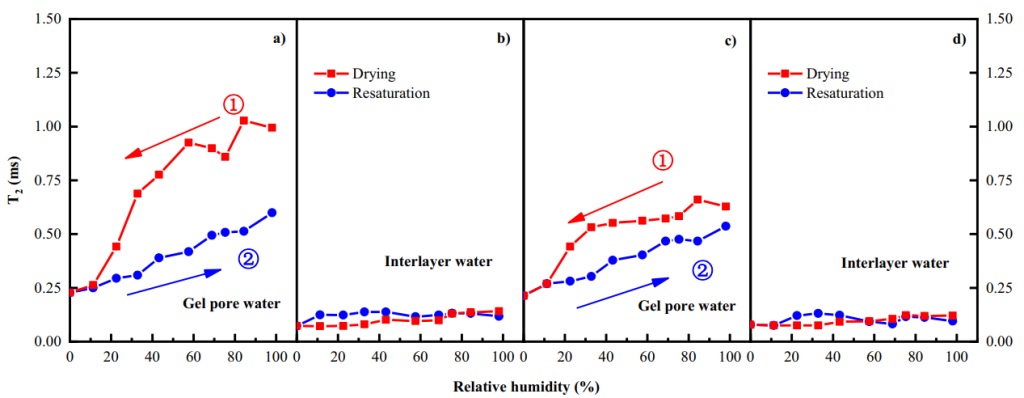 为了进一步了解C-S-H在第一次D-R周期内的水解吸-吸收行为和微观结构变化,对样品进行了LF-NMR测量。LF-NMR结果由Butler-Reeds-Dawson(BRD)算法反演得到。典型的结果显示在图5中。所有测量的样品只观察到两个T2约为0.06毫秒和0.2毫秒的峰值,它们分别代表C-S-H结构中的层间水和凝胶孔隙水。
