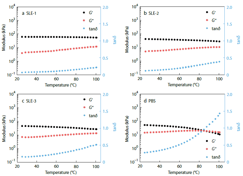 作者进一步通过流变学实验对SLE材料的粘弹性进行了表征。流变学是研究高分子链段运动的经典方法。SLE材料的储能模量在测试的温度范围内大于其损耗模量,呈现出较好的热稳定性,但在高温下储能模量略有下降,这可能是硼氧配价键在高温下迅速解离所致。