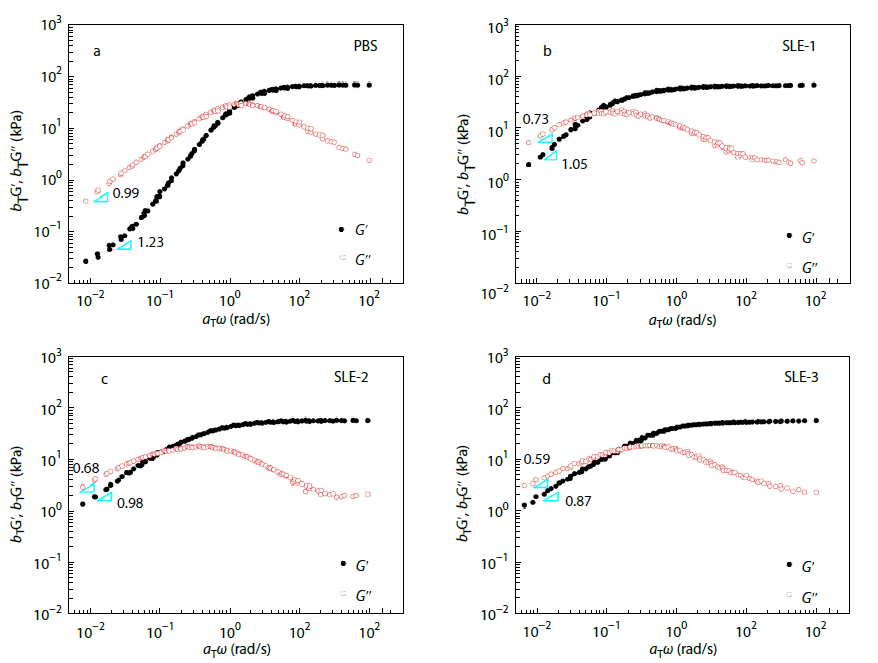 为了进一步探究动态键对SLE线性粘弹性的影响,作者使用小振幅振荡剪切实验,并根据时温叠加原理将不同温度下获取的动态模量曲线平移叠加,得到如下图所示的主曲线。SLE及PBS的储能模量、损耗模量主曲线末端斜率均小于Maxwell模型预测值,这也进一步反映了体系的动力学不均匀性。主曲线平台模量随着PBS含量的增加减小,对应于更小的交联密度,这与MQ NMR的结果对应。