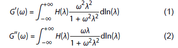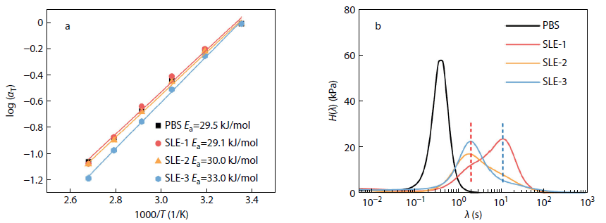 作者使用arrhenius公式对动态模量主曲线平移因子拟合,发现动态键含量的增加阻碍了链段的运动,导致其相对活化能随PBS含量的增加而增加,这与FFC NMR的实验结果相符合。动态模量主曲线可由以下公式拟合得到松弛时间谱H(λ),