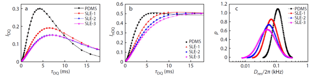 为了探究动态键含量对材料内部结构的影响,作者首先使用质子多量子核磁共振(1H MQ NMR)方法研究该材料网络结构均匀性。偶极耦合相互作用被广泛用于分子结构表征,但在溶液或柔性体系中偶极相互作用容易被分子扩散运动平均。对于高分子链段运动受限的体系(如缠结高分子网络、交联高分子网络等),偶极耦合相互作用因链段运动受限而难以被完全平均,进而可通过特定脉冲激发双量子信号。随着激发时间的增加,双量子信号的强度呈现出先增长再减弱的趋势,如下图a。通过对双量子信号进行归一化并进行拟合(图b),我们可以获得体系残余偶极耦合相互作用(Dres)的分布情况(下图c)。残余偶极耦合相互作用的大小与受限链段的分子量呈负相关,因而其分布可以反应体系网络结构均匀性。对于SLE样品,随着硼酸酯动态键含量的增加,体系网络结构不均匀性增加,这可能是引入的含硼酸酯PBS与Vinyl PDMS间的硼氧配价键阻碍了Vinyl PDMS的链段运动,因而可能在一定程度上妨碍了化学交联反应;另一方面,体系内PBS之间可能存在由硼酸酯缩聚形成的动态键交联结构也会使网络结构变得更加不均匀。