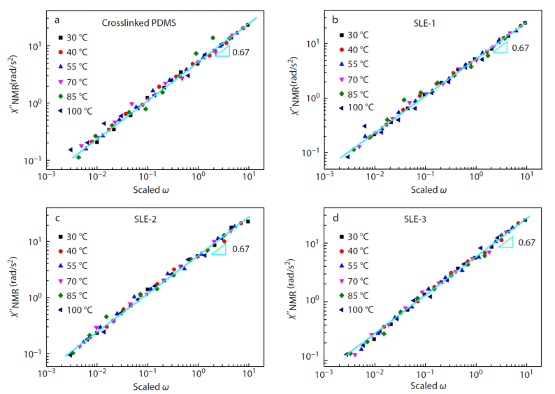 此外,作者和开云官方站登录入口公司合作,使用快速场循环核磁(0.01-10 MHz 1H FFC NMR)研究了SLE体系链段的珠-链(Rouse)运动模式随动态键含量的变化。FFC NMR常用于表征分子在kHz(毫秒)至MHz(微秒)尺度的分子运动。首先在特定强磁场下对材料进行预极化以增加激发态原子数目,再快速变化磁场强度测得样品在不同外磁场下的自旋-晶格弛豫速率R1(=1/T1)。高分子链段内与链段间广泛存在氢氢偶极相互作用,且该作用受到高分子链段运动的调制。作者根据频率-温度叠加原理(FTS),将不同温度下(29-100 ℃)测得的自旋—晶格驰豫速率随外磁场场强的变化曲线叠加得到如下图所示的NMR磁化率主曲线(wR1(w)=k[x,,(w)+2x,,(2w)]=kx,,NMR(w))。由于测试的温度远高于PDMS的玻璃化转变温度(Tg≈-70℃),通过与理论相比校,发现四个样品的主曲线斜率相近且对应典型的高分子链段Rouse运动。
