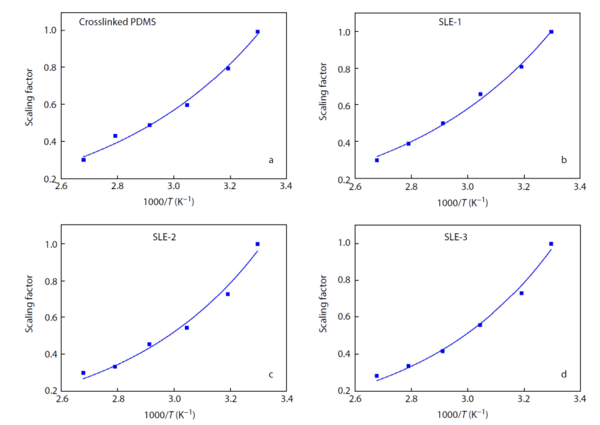 根据Arrhenius公式,作者对主曲线叠加时的平移因子拟合得到了链段运动的相对活化能,其数值随PBS含量的增加而增大,说明PBS会在一定程度上阻碍PDMS链段的Rouse松弛运动。