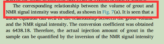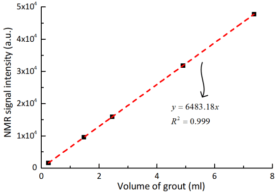 通过对不同体积浆液进行核磁共振测试,可以拟合得到核磁信号强度与浆液体积间的定量关系,据此可对注浆过程中进入试样的实际浆液注入量进行定量反演。