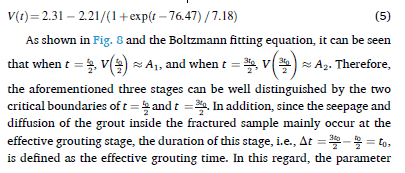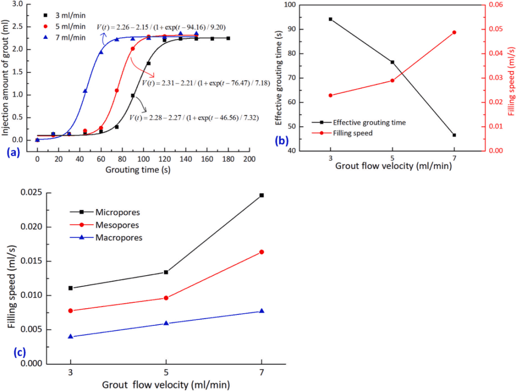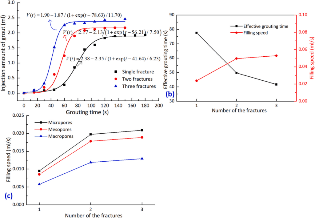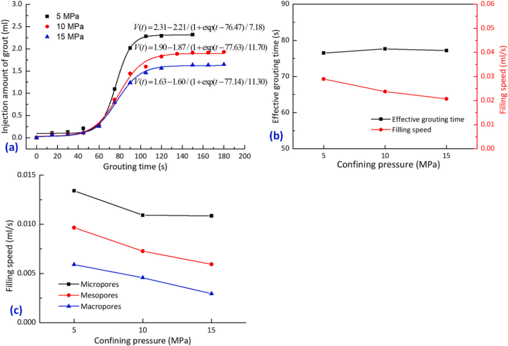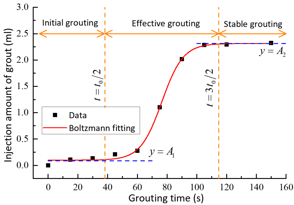 从图中可以发现,采用玻尔兹曼方程可以很好的拟合浆液注入量与注浆时间的变化关系。进一步地,通过拟合方程,我们可以定义有效注浆时间(即有效注浆阶段的持续时间)、浆液充填速率(即有效注浆阶段曲线的斜率)2个指标对不同条件下注浆渗透扩散特性进行深入分析。