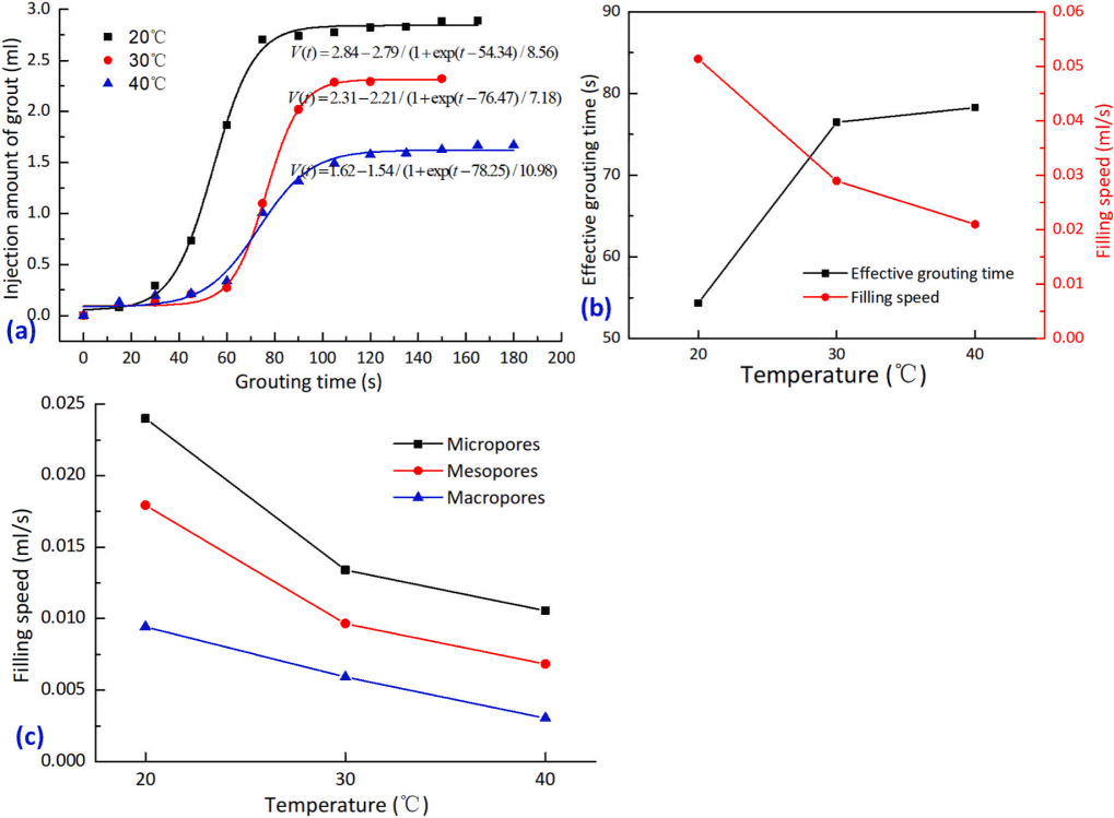 图6显示了温度对渗透注浆扩散特性的影响。温度对注浆过程的影响主要表现在浆液最终注入量和有效注浆时间等参数方面。高温下浆液的黏度增大,流动性下降,导致浆液在孔隙中的扩散阻力增大,从而使得试样内浆液最终注入量减少,有效注浆时间增大,浆液充填速率下降。随着温度的升高,3类孔隙中的浆液充填速率均呈现出非线性下降趋势。并且,相同温度下,微孔隙的浆液充填速率最大,细孔隙的浆液充填速率次之,而大孔隙的浆液充填速率最小。