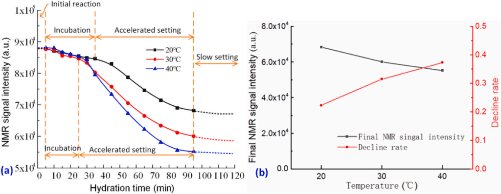 利用核磁共振测试系统对不同温度下浆液的水化过程进行跟踪测试,获得水化过程中浆液的T2核磁信号强度变化,如图2所示。可以看到,潜伏期内,浆液的核磁信号强度缓慢减小,常温下(即20℃)潜伏期的水化时间范围为5~35 min,而温度较高时(如30℃,40℃)潜伏期明显缩短至5~25 min。潜伏期与浆液的黏度稳定期吻合,注浆试验应该尽量利用好浆液在潜伏期良好的流动性,在加速凝结期开始前完成。