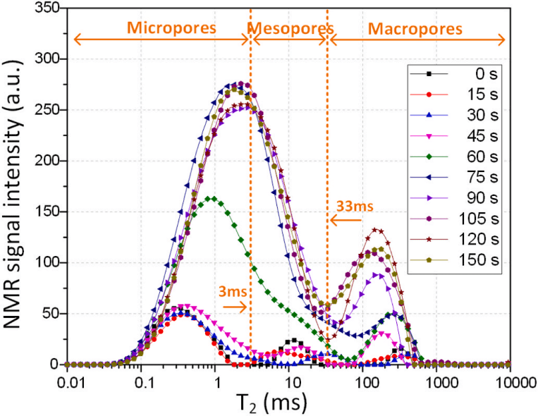 图4 单裂隙砂岩试样注浆过程中的T2谱曲线(T= 30℃)