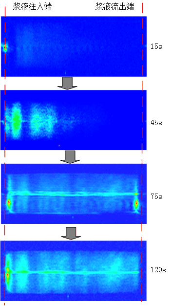 图5试样注浆全过程动态发展的核磁共振图像。可以看到,注浆试验开始15 s时,浆液开始向裂隙周围扩散,此时像素点较少,试样整体比较暗;随着试验的进行,注浆至45 s时,浆液逐渐聚集在注入口一侧,入口端的像素点也增多,亮度明显大于另一侧;随后,浆液继续向试样另一端流动,直至贯通裂隙,在人工裂隙中形成贯通亮点线;最后,浆液由主裂隙向试样的孔隙中继续扩散,直到注浆完成时,浆液充分进入试样各区域,试样达到注浆稳定状态。