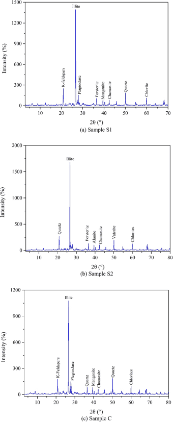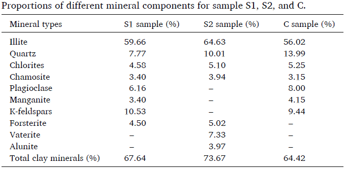 表2显示,所有土壤中包含的主要矿物是伊利石,占检测到矿物的一半以上。S1、S2和C的粘土矿物含量分别为67.64%、73.67%和64.42%。粘土矿物的颗粒非常精细,其表面有许多负电荷,具有大比表面积的粘性矿物颗粒的表面可以形成更多的粘性水化膜。换句话说,粘土矿物对结合的含水量有明显的影响,粘土矿物含量越大,比表面积越大,结合水越大。