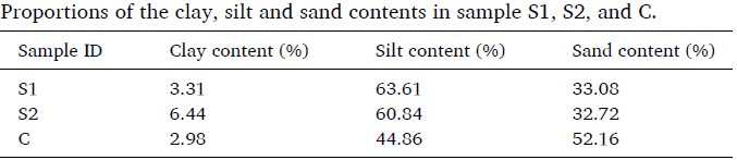 业界普遍认为,粘土含量是水土系统中不可忽略的影响因素。因此,在土壤冻结过程中,有必要考虑粘土含量对未冻水含量的影响。首先,需要确定土壤样本中的粘土含量。不同的国家和地区有不同的划分方法。在这项研究中,使用USDA/FAO系统进行划分。如下表所示,S1和S2的粘土和粉砂颗粒含量相对较高,而沙粒含量较低,C的沙粒含量较高,粘土和粉砂颗粒含量较低。S1、S2和C的粘土含量分别为3.31%、6.44%和2.98%。