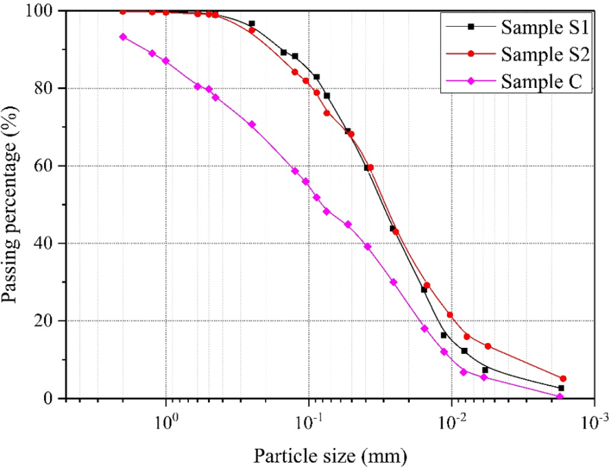土壤样品在110◦C的烤箱中干燥12小时后被压碎。然后使用标准筛子和密度计确定土壤样本的PSD。三种土壤样本的PSD曲线如下图所示。在PSD测量之后,使用DX-2700 X射线衍射仪对样品进行分析,以确定土壤样品的矿物成分。