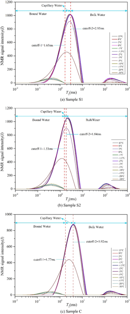 为了准确计算三种类型的水的含量以及变化,有必要区分三种类型的水(自由水、毛细水和束缚水)。在核磁理论中,对于分布在不同孔隙中的水,T2是变化的,不同的弛豫时间T2对应于不同类型的水。孔隙水和土壤颗粒之间的物理和化学反应的强度随着与颗粒表面距离的增加而降低,束缚水的冻结点比毛细水和自由水的要低。