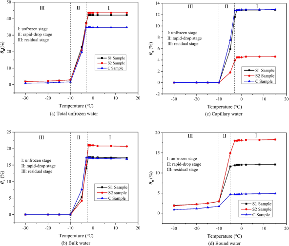 在第一个阶段未冻水含量保持不变;当温度低于零下某一点温度时,三种类型的未冻水含量快速下降;当第三阶段的温度低于-10◦C时,土壤中的未冻水含量趋于稳定,自由水和毛细水含量都变为零,只有束缚水仍然存在,这被称为残余阶段。