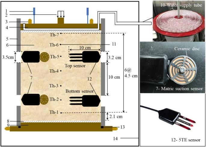 图2说明了定制设计的F-T测试装置。为了模拟AGF工程中的冻结条件,冷端被放置在仪器的底部。沿该装置安装了7个温度计、7个传感器,以监测F-T期间的温度、解冻水含量、体积电导率和吸力。