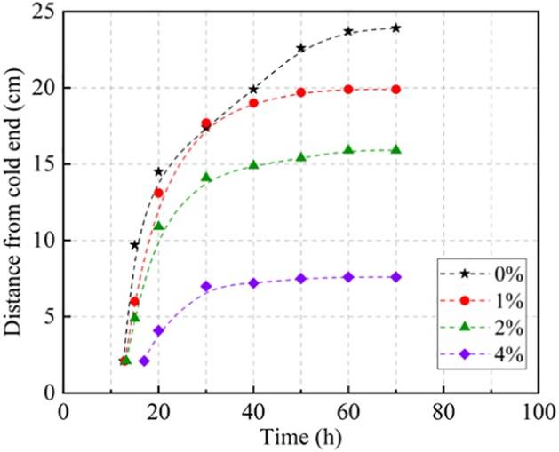 以前的研究表明,单向冻结期间的温度分布在靠近冷端的部分是线性的,在非稳态的暖端附近是曲线线性的。因此,非稳态的冻结前沿的位置也是通过线性插值确定的,因为它在冻结的早期阶段接近冷端。图4说明了冻结前沿位置的演变,即与冷端的距离随着时间发生推移。可以看到,冻结前沿在冻结开始时移动得很快,然后在冻结过程结束时逐渐达到一个热平衡状态。在快速移动阶段,由于盐引起的冰点变低,盐含量较高的样品,其冻结前沿移动速度比盐含量较低的样品慢。在稳定阶段,冻结前沿的最终位置取决于盐含量,盐含量较低的土壤样品在更加远离冷端的地方有一个冻结前沿。此外,盐随水向冷端迁移,在孔隙水冻结时被排斥在冰外。因此,盐的浓度在冻结前沿附近增加,这进一步抑制了向上运动。
