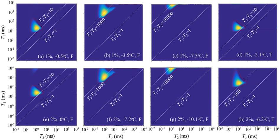 如图5所示,选择了四个温度下两种盐含量的样品得到的低场核磁T1-T2测试结果,以说明F-T期间T1-T2相关光谱的代表性阶段以及温度和盐含量的影响。具体来说,挑选了四个温度,如图5所示。从每个样品中选择了一个低于冰点的温度(例如,1%盐含量的-3.5℃和2%盐含量的-7.2℃),以便来分析温度和盐含量对水分子流动性的影响。T 1/T 2比率是一个说明分子流动性的特征参数。