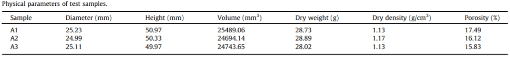 测试样本取自广西玉林的一座煤矿。所选的煤被埋在大约300米的深度,原位应力约为10兆帕。煤块被钻取芯、切割和抛光,并加工成六个高度为50毫米、直径为25毫米的圆柱形样品。我们选择了三个完整的煤样,并将其送到实验室进行以下实验。样品的物理特征如表1所示。