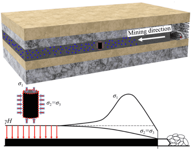 在煤炭开采过程中,煤炭经历了从原生岩石应力到垂直应力增加和水平应力缓慢下降的完全动力学演变(图二),煤的PFS和渗透率因此发生了改变。