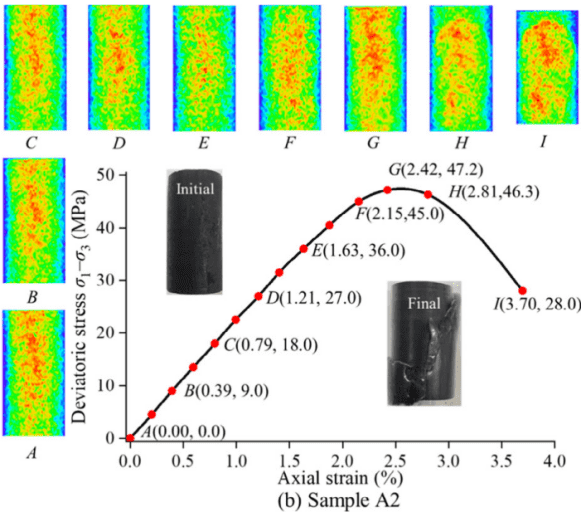 SPF含量最初下降,然后随着应变的增加而增加,截止点在峰值应力的80%对91%,与NMRI的结果一致。