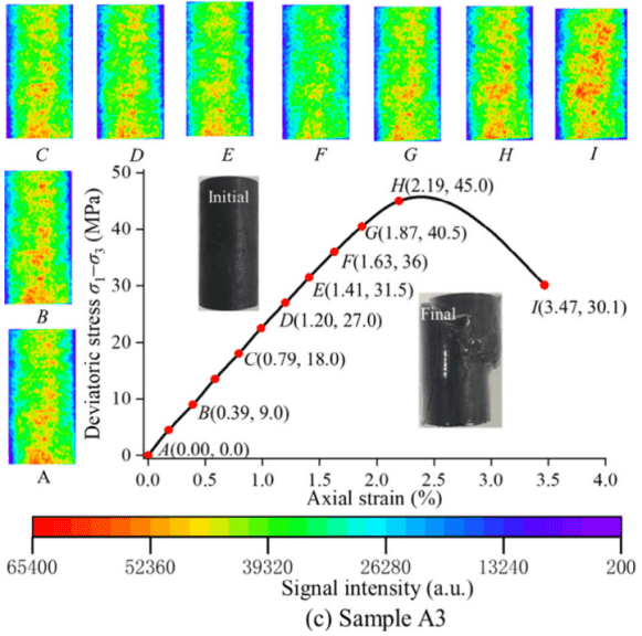 根据NMRI结果,样本A1和A3下部的水含量高于上部的水含量。相比之下,样本A2在上部的含水量高于下部的含水量,表明测试样本的PFS的主要空间位置分布不均匀,这可能是它们峰值应力不同的原因。