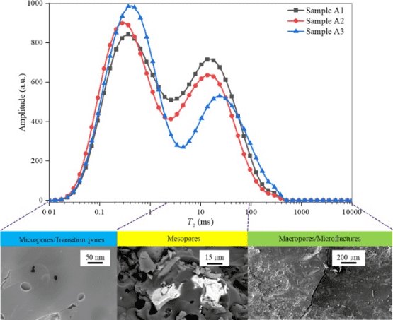 图4显示了静水压力下每个煤样的T2谱。根据传统的孔隙分类方法,左边的峰值(T2<2.5 ms)对应于微孔和过渡孔隙,中间的峰值(2.5100 ms)对应于大孔和裂缝。