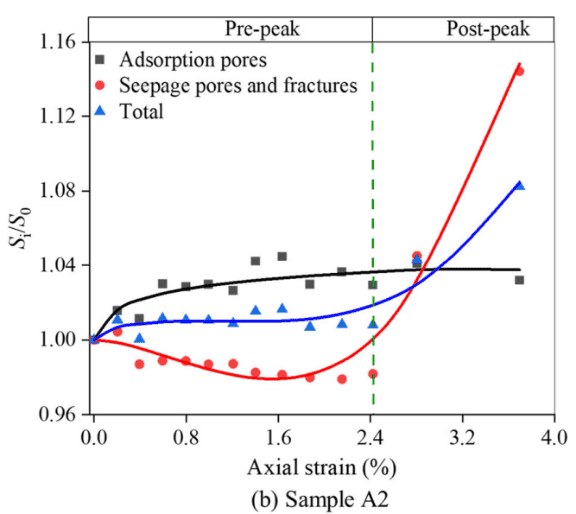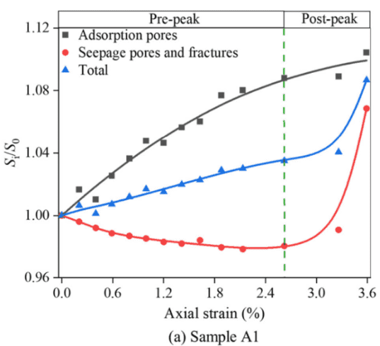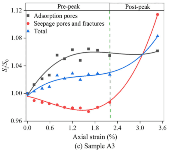 在峰值前阶段,随着偏离应力的增加,样品中的水含量最初下降,然后增加。样品的含水量在加载的初始阶段下降,主要有两个原因:样品的原始PFS的压实速度高于新孔隙的生成速度;部分新孔隙没有连接。因此,水不能进入这些部分,核磁共振信号不能被检测到。