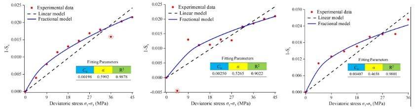 通过对实验数据进行拟合,取得了较好的拟合效果。说明在峰前压缩过程中重新建立应力增量与渗流孔体积增量之间的关系是可行的,所提出的渗流孔压缩的分数阶导数模型可以较好地描述峰前压缩阶段渗流孔压缩的实验结果。