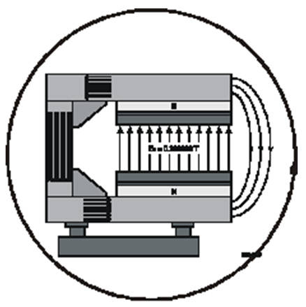 无源匀场是在磁极的内外表面贴小磁片或磁钢片,通过小磁片或磁钢片对局部磁力线的改变从而调整磁场均匀性,本实验装置中由于磁极间的均匀性较好,因此未采用无源匀场方式。下面实物图中小磁片即是无源匀场方式匀场。