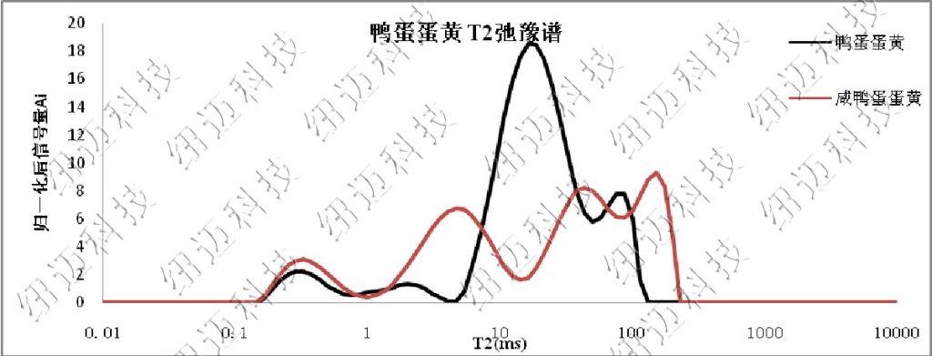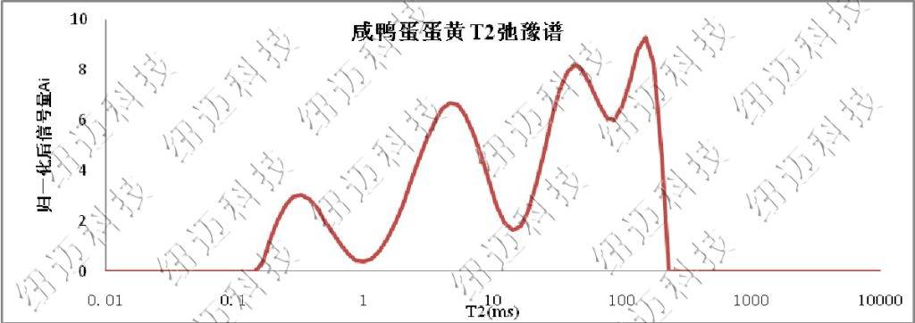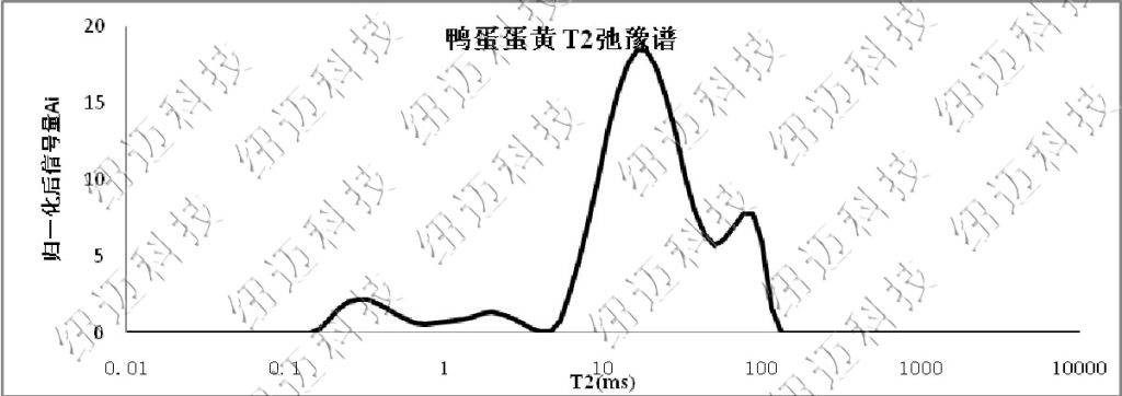 通过对核磁T2波谱分析,可以清晰的看到咸鸭蛋黄与普通鸭蛋黄的在油脂状态上的不同。