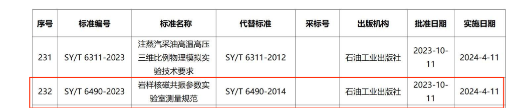 国家能源局于2023年10月11日发布《中华人民共和国石油天然气行业标准》,从2024年4月11日起施行。其中《岩样核磁共振参数实验室测量规范》明确规定了,实验室测量岩样核磁共振参数的主要测量仪器、主要试剂制备、岩样制备、岩样测量、结果处理和允许不确定度的要求。适用于岩样或岩屑核磁共振参数的测量。
